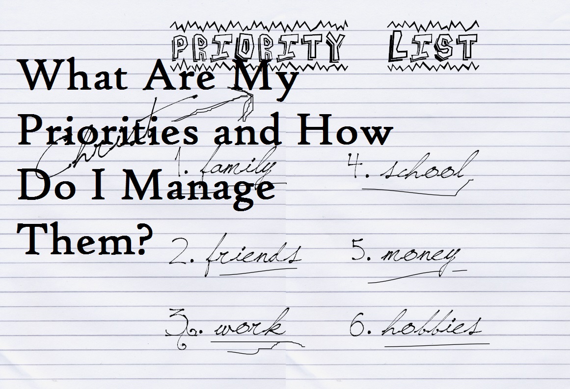 For example, I can say that my “Top” Priorities all the time are as follows: (1) My relationship with God. (2) Family. (3) Fitness. (4) My Job. (5) Hobbies & Friends.